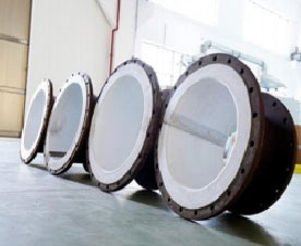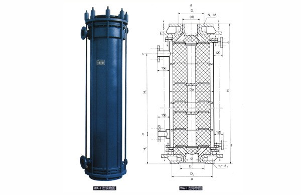 YKA型圓塊式石墨熱交換器以圓柱 體型單元積木式疊裝而成,結(jié)構(gòu)強度高,石墨件間墊以四氟質(zhì)或特種橡膠質(zhì)等質(zhì) 地密封件.密封可靠,設備導熱效率高,耐溫、抗沖擊、耐壓等性能優(yōu)越。本型設備分成I型與II型,I型載熱體切向進入換熱塊,相鄰兩塊方向錯開,縱向物料經(jīng)短 通逐塊再分配而紊流效應顯著,下封頭附 加氣液分離的則成冷凝器,若上封頭改成 蒸發(fā)室則形成蒸發(fā)器。YKA-II型載熱體徑 向進入換熱塊,殼體按外折